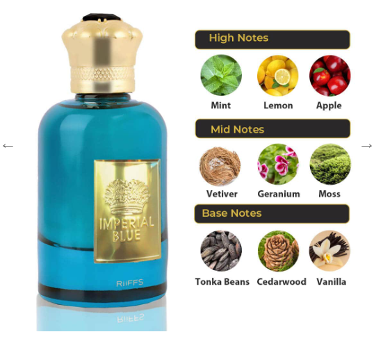 A regal and majestic fragrance that envelops you in a luxurious aura, capturing the essence of blue allure.